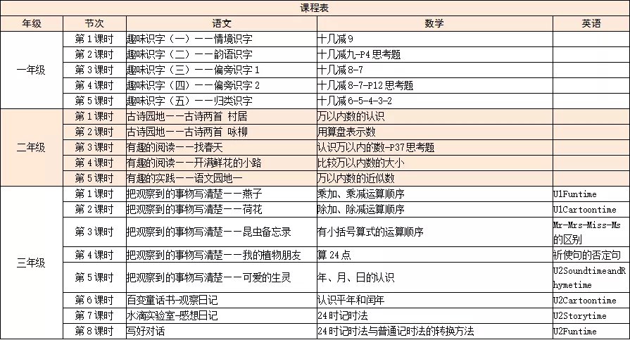 小学1-3年级自主学习安排表