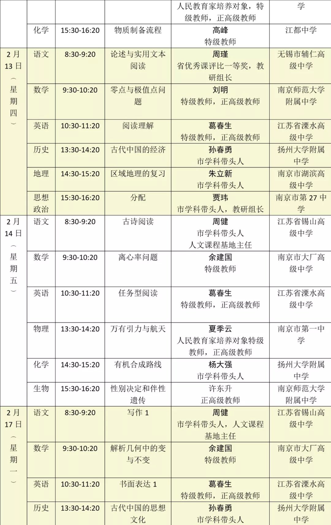 高三年纪专题复习课程表: