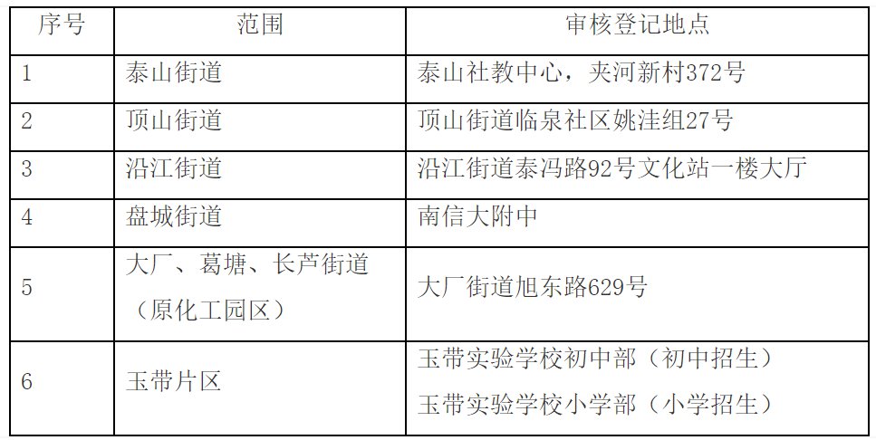 6月27日~28日,符合相关条件的随迁子女父母(或法定监护人)根据居住证地址,持相关材料(见上文2.随迁子女入学)到下列地点审核登记。