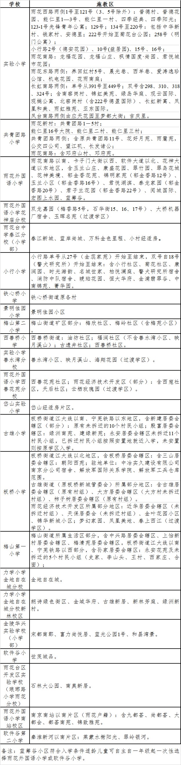 南京雨花台区2020年小学施教区划分一览表
