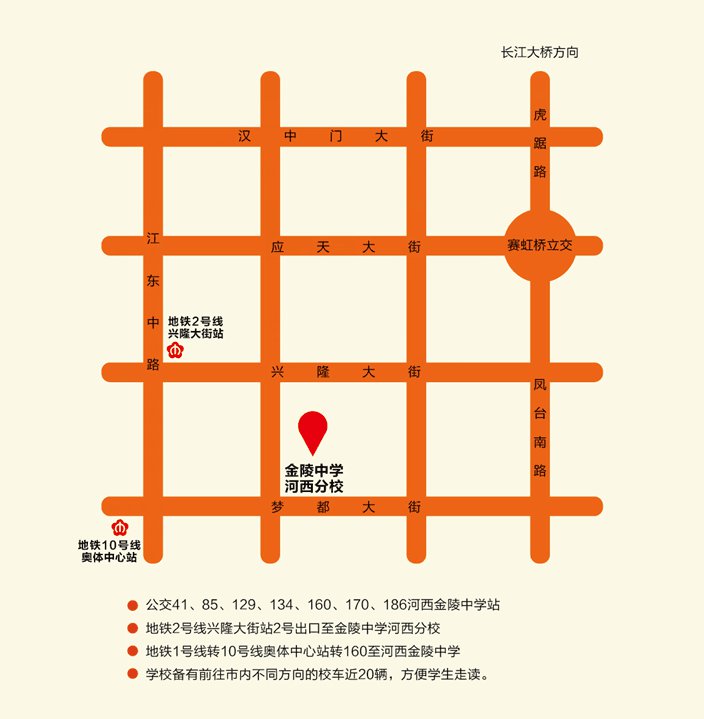 公交:160、134、186、57、41 金陵中学河西分校站