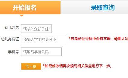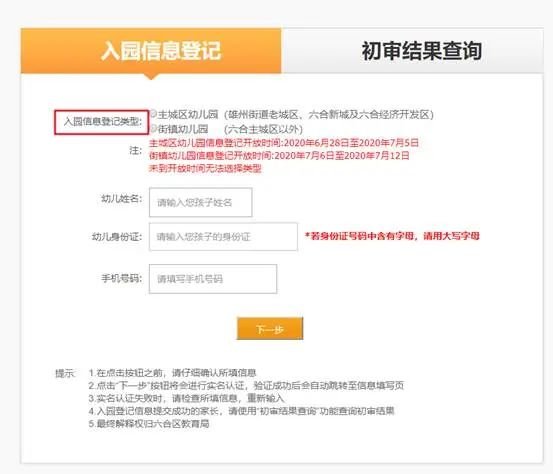 选择入园信息登记类型,填写幼儿姓名,身份证和手机号,点击下一步。