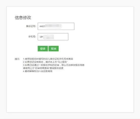 输入身份证和手机号点击登陆进行修改信息,修改完成后提交。