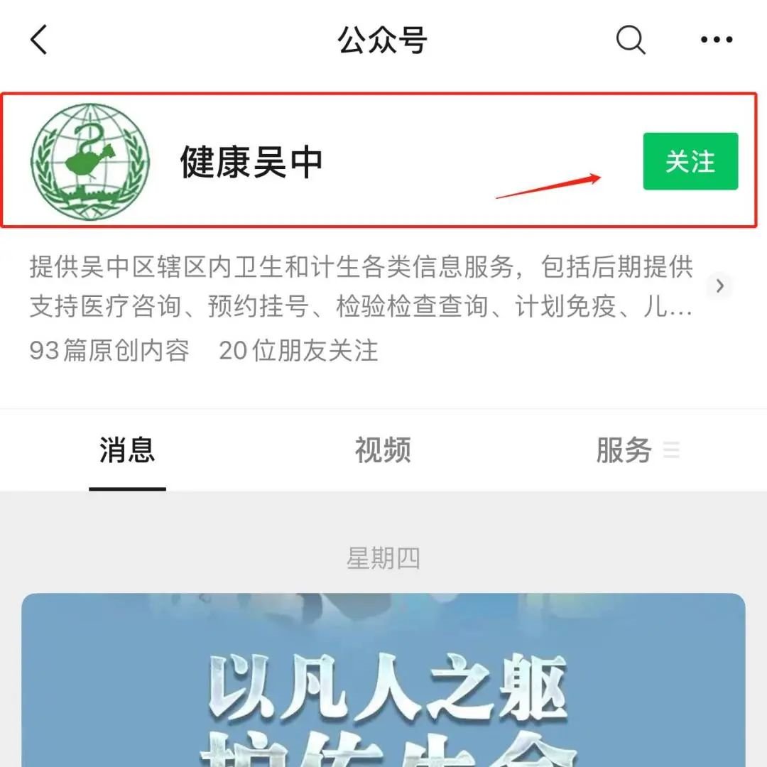 1、微信关注健康吴中公众号