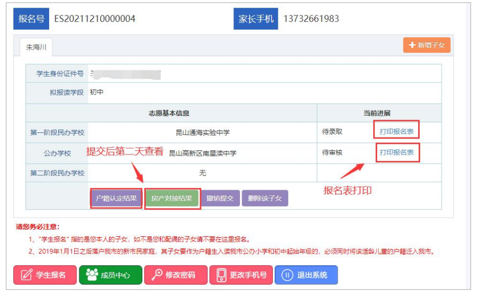 网上报名提交报名后,界面如下图所示,提交第二天可以查看系统自动初审的【户籍认定结果】、【房产对接结果】。