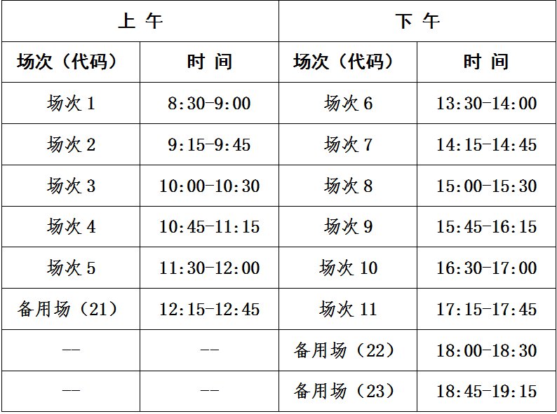 英语四级口语考试(CET-SET4)考试时间为11月20日,英语六级口语考试(CET-SET6)考试时间为11月21日,具体场次安排如下: