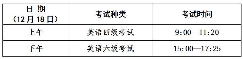 英语四级口语考试(CET-SET4)考试时间为11月20日,英语六级口语考试(CET-SET6)考试时间为11月21日,具体场次安排如下: