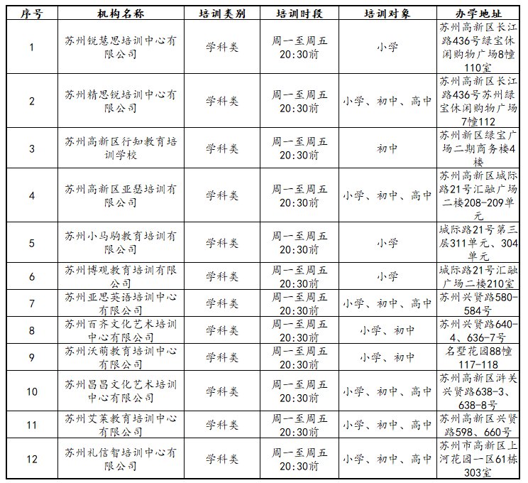 根据苏州高新区新型冠状病毒感染的肺炎疫情防控指挥部学校防控组《关于有序做好我区校外培训机构恢复线下培训工作的通知》精神,经校外培训机构申请、区教育局、属地镇(街道)会同相关部门检查验收,现对新增符合恢复线下培训规定的23家证照齐全的校外培训机构名单予以公布,自即日起,以下机构可以恢复线下集中培训。