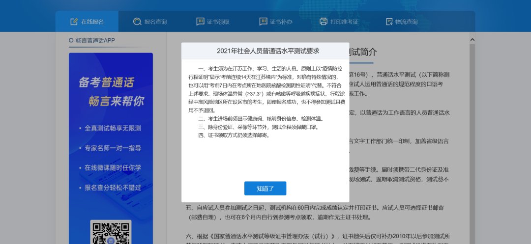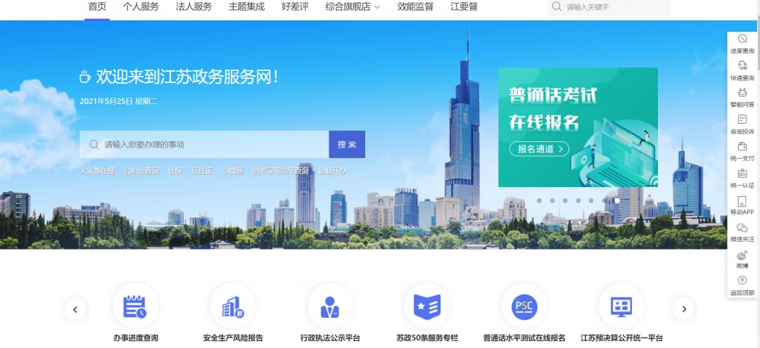 1、实名注册并登录江苏政务服务网(http://www.jszwfw.gov.cn),搜索“普通话水平测试”或点击进入省教育厅旗舰店在线报名。