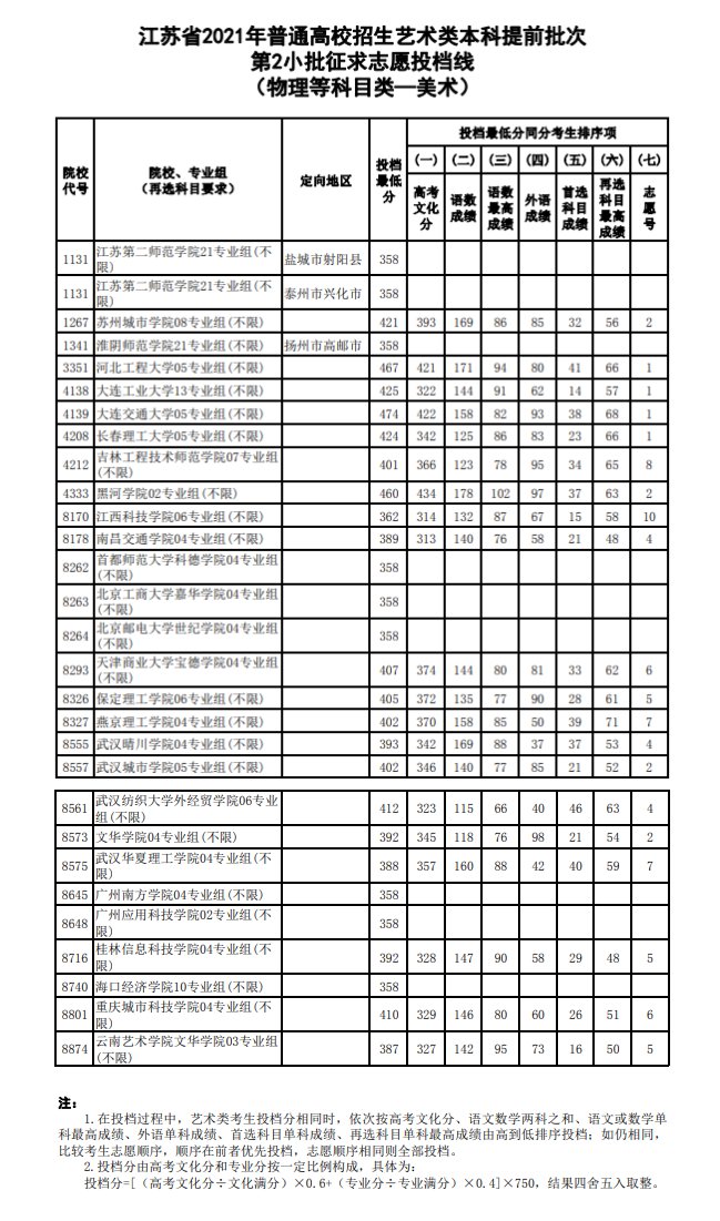 2021年江苏高考艺术类提前批次征求志愿投档线汇总