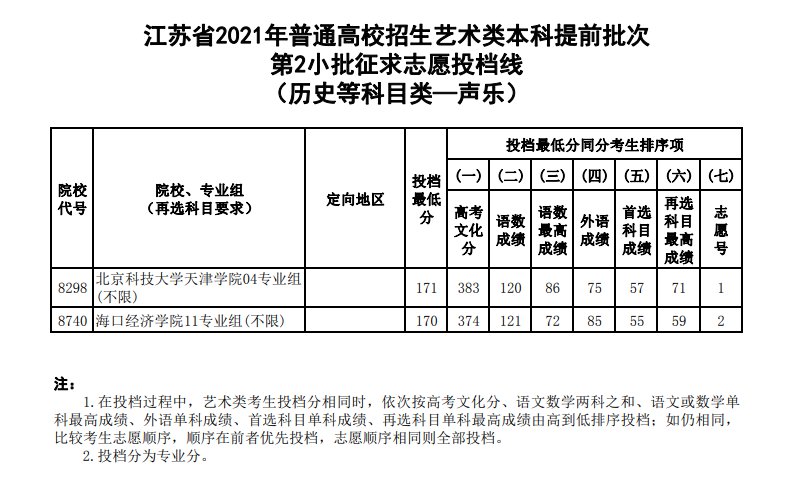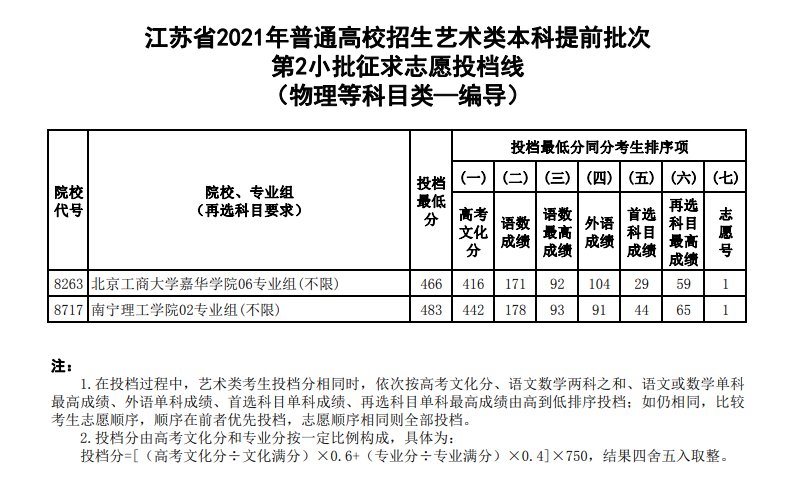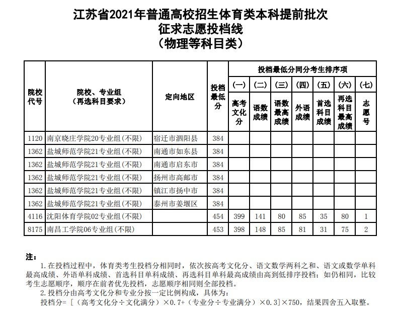 2021年江苏高考体育类和艺术类提前批次征求志愿投档线一览
