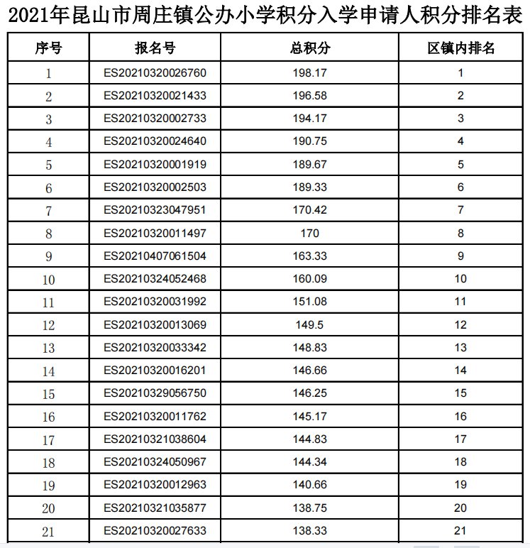 2021年昆山周庄镇积分入学积分排名公示(小学+初中)