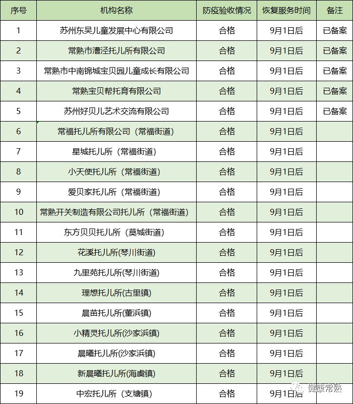 经研究,决定同意如下列表单位在9月1日后可以恢复线下服务。其他未经防疫验收合格的托育机构不得私自恢复线下服务。