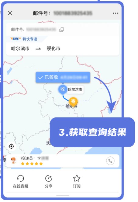 2、菜单栏查询:点击公众号菜单栏可快速召唤查询服务页,get邮件揽收与派送情况。