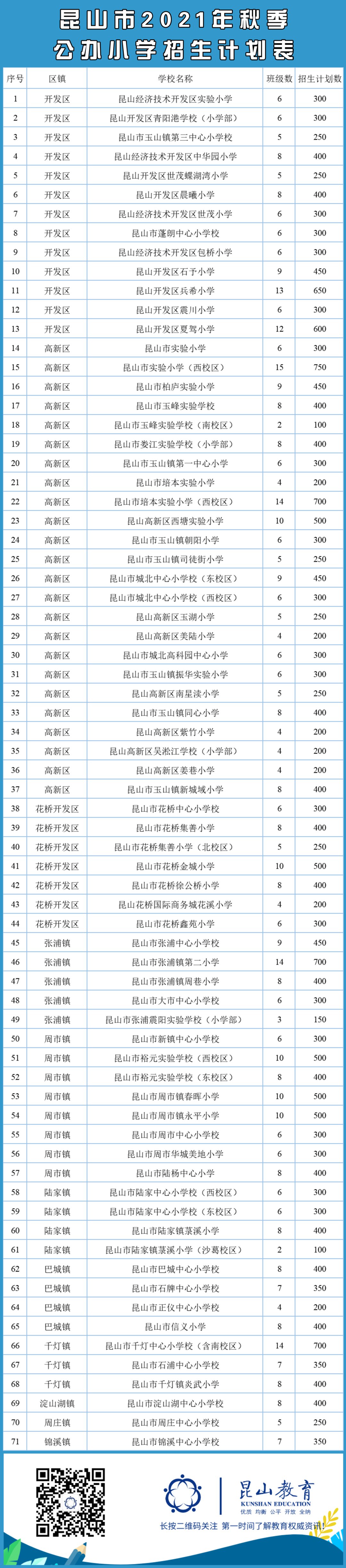 根据昆山市2021年义务教育学校招生工作意见,现就昆山市2021年秋季义务教育公办学校招生计划公布如下: