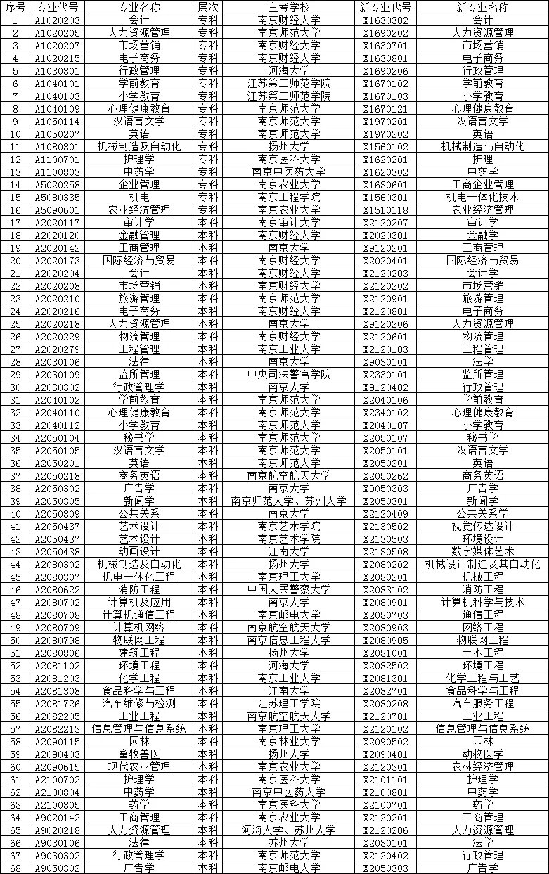 根据《省教育考试院关于调整江苏省高等教育自学考试部分专业名称和代码的通知》(苏教考自〔2019〕12号)要求,我省从2021年10月考试开始,我省面向社会开考专业全部启用新专业名称和代码,所有考生均按新专业名称报考及申请毕业,新旧专业名称和代码对照情况详见《江苏省高等教育自学考试新旧专业对照表》。