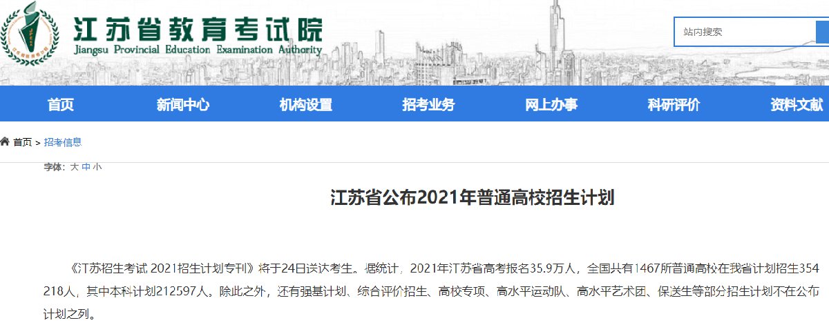 《江苏招生考试 2021招生计划专刊》将于24日送达考生。2021年江苏省高考报名35.9万人,全国共有1467所普通高校在我省计划招生354218人,其中本科计划212597人。除此之外,还有强基计划、综合评价招生、高校专项、高水平运动队、高水平艺术团、保送生等部分招生计划不在公布计划之列。