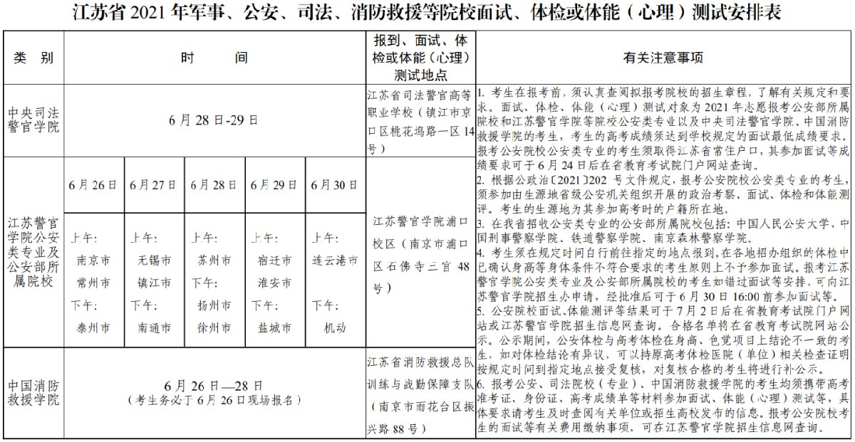 2.凡高考成绩、选考科目达到规定要求,有意报考公安部所属院校及江苏警官学院公安类专业且符合相关公安院校体检标准的考生,于 6 月 26 日至 30 日持本人身份证、户口簿、准考证、高考成绩单和疫情防控健康筛查表等前往江苏警官学院浦口校区(南京市浦口区石佛寺三宫 48 号),参加由江苏省公安厅与有关院校共同组织的面试、体检和体能测评。面试、体检、体能测评等结果将于规定时间在江 苏省教育考试院网站公示,公示期间,公安体检与高考体检在身高、色觉项目上结论不一致的考生,如对体检结论有异议,可以持原高考体检医院(单位)相关检查证明按规定时间到指定地点接受复核,对复核合格的考生将进行补公示。