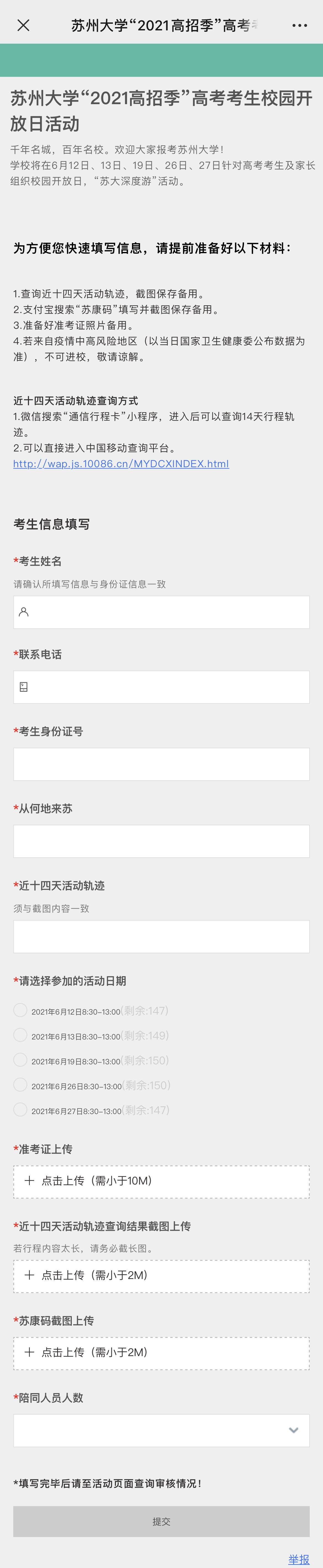 1.查询近十四天活动轨迹截图保存备用(可以在微信搜索“通信行程卡”小程序,进入后可以查询14天行程轨迹或者直接进入中国移动查询平台http://wap.js.10086.cn/MYDCXINDEX.html查询),所有申请进校参观的考生及家长均需要上传该项内容。