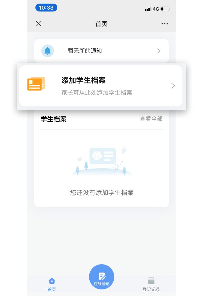 登录完成后,即可进入学生登记的首页界面,家长可先进行学生档案的添加。
