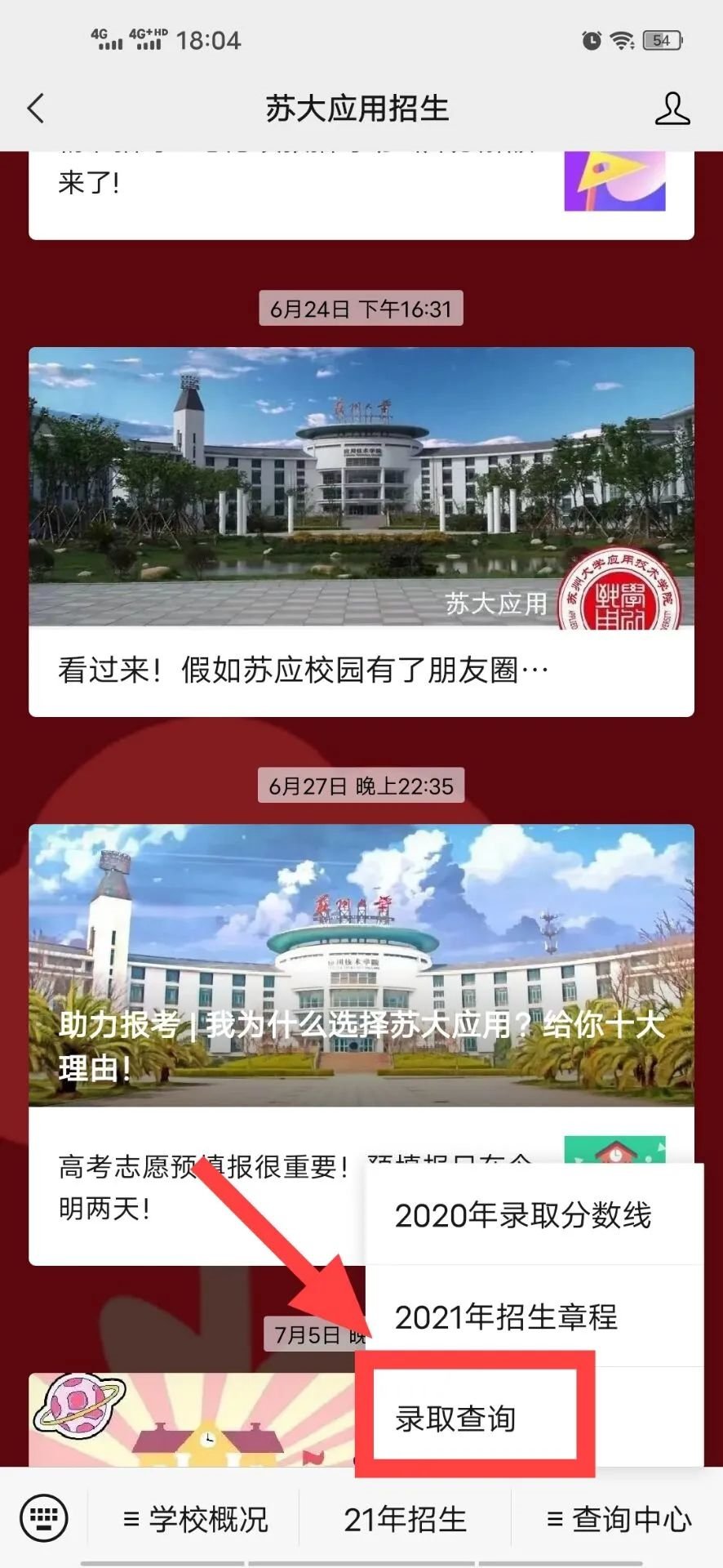 关注后点击菜单栏的录取查询