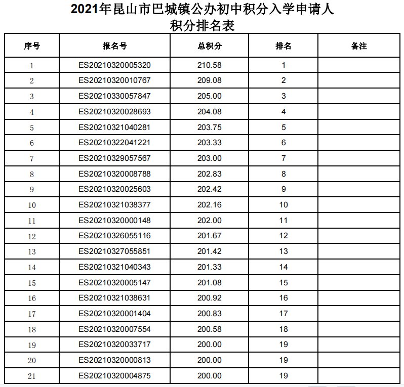 2021年昆山巴城镇积分入学积分排名公示(小学+初中)
