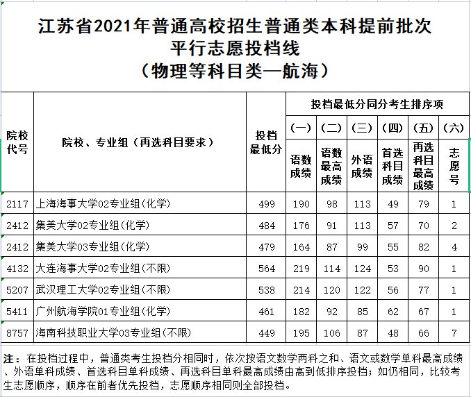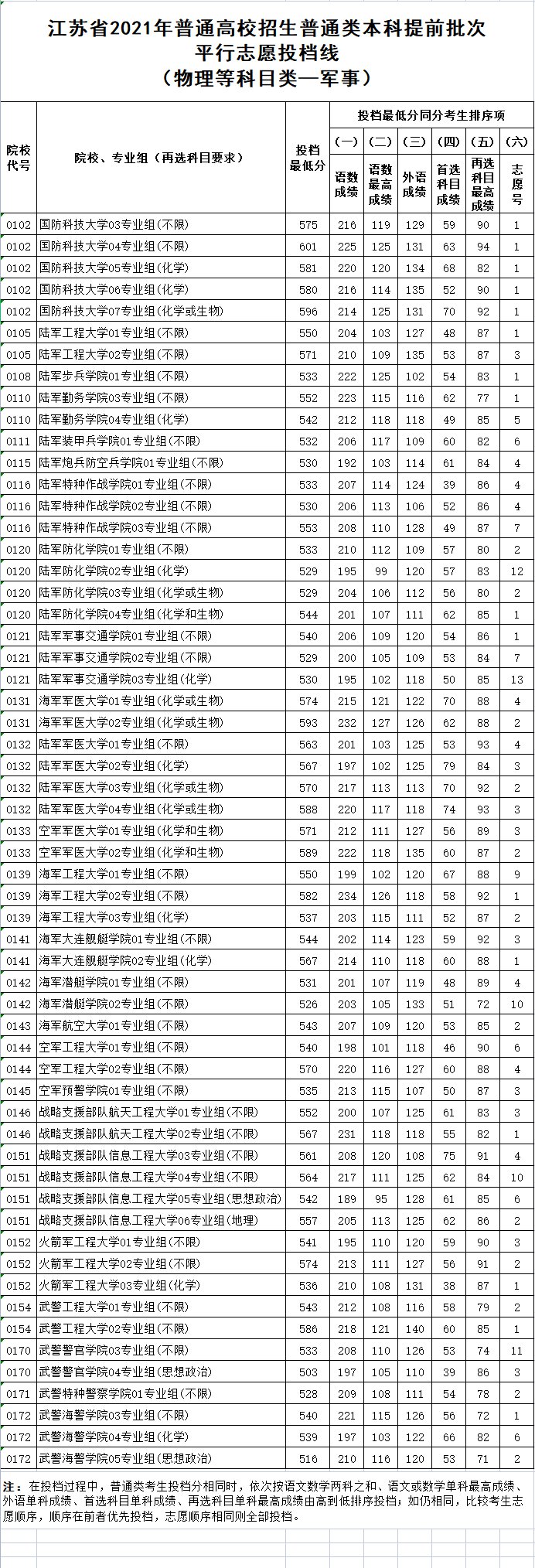 江苏省2021年普通高校招生普通类本科提前批次平行志愿投档线(物理等科目类)