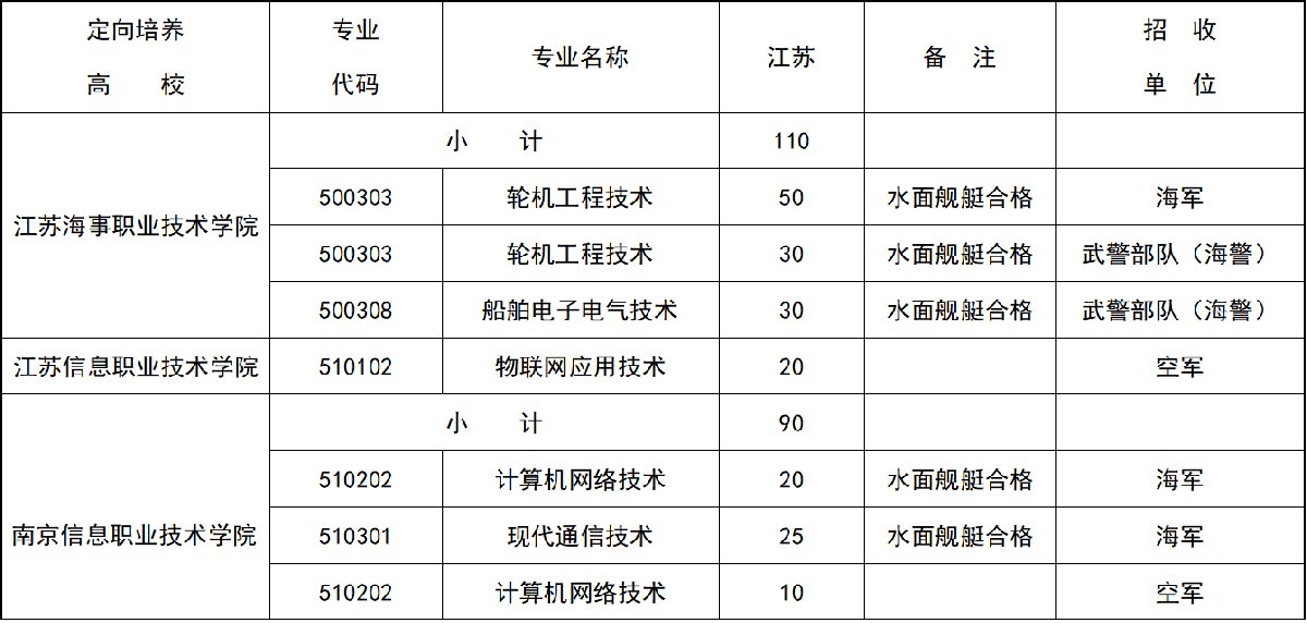 2021年江苏省定向培养士官专业和招生地区分拨计划