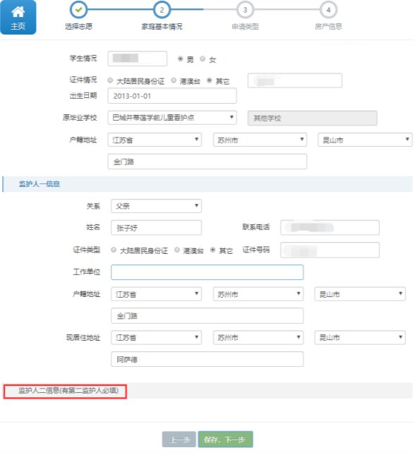 填报完【监护人一信息】后,点击【监护人二信息】进行填报。