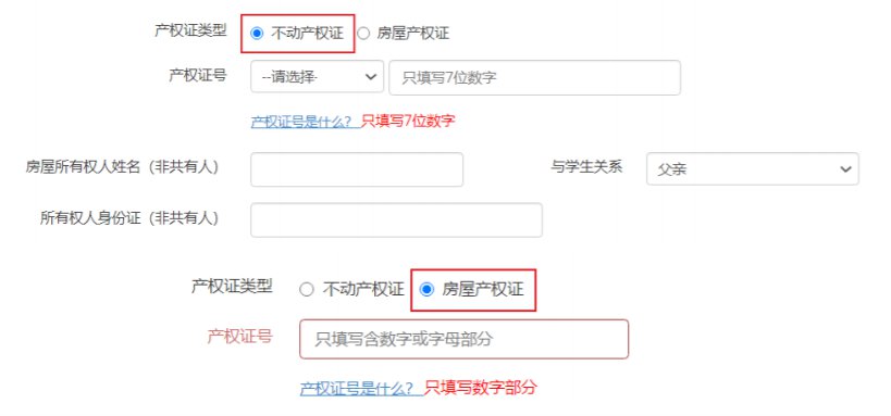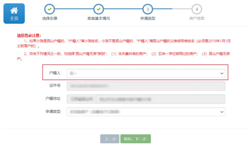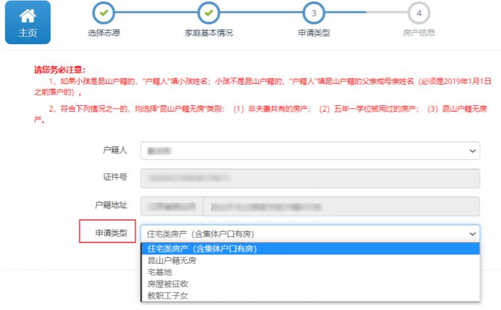• 申请类型:申请类型为“住宅类房产(含集体户口有房)”“教职工子女”需填写房产信息,“ 昆山户籍无房”“宅基地”“房屋被征收”需填写现居地地址。申请类型为 “昆山户籍无房” ,必须填报公办学校志愿。