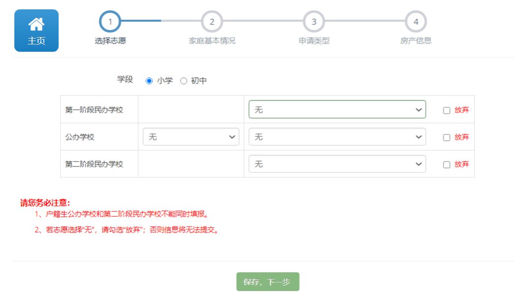 • 选择志愿:选填民办学校志愿与公办学校志愿。公办学校志愿和民办学校第二阶段志愿不能同时填报。