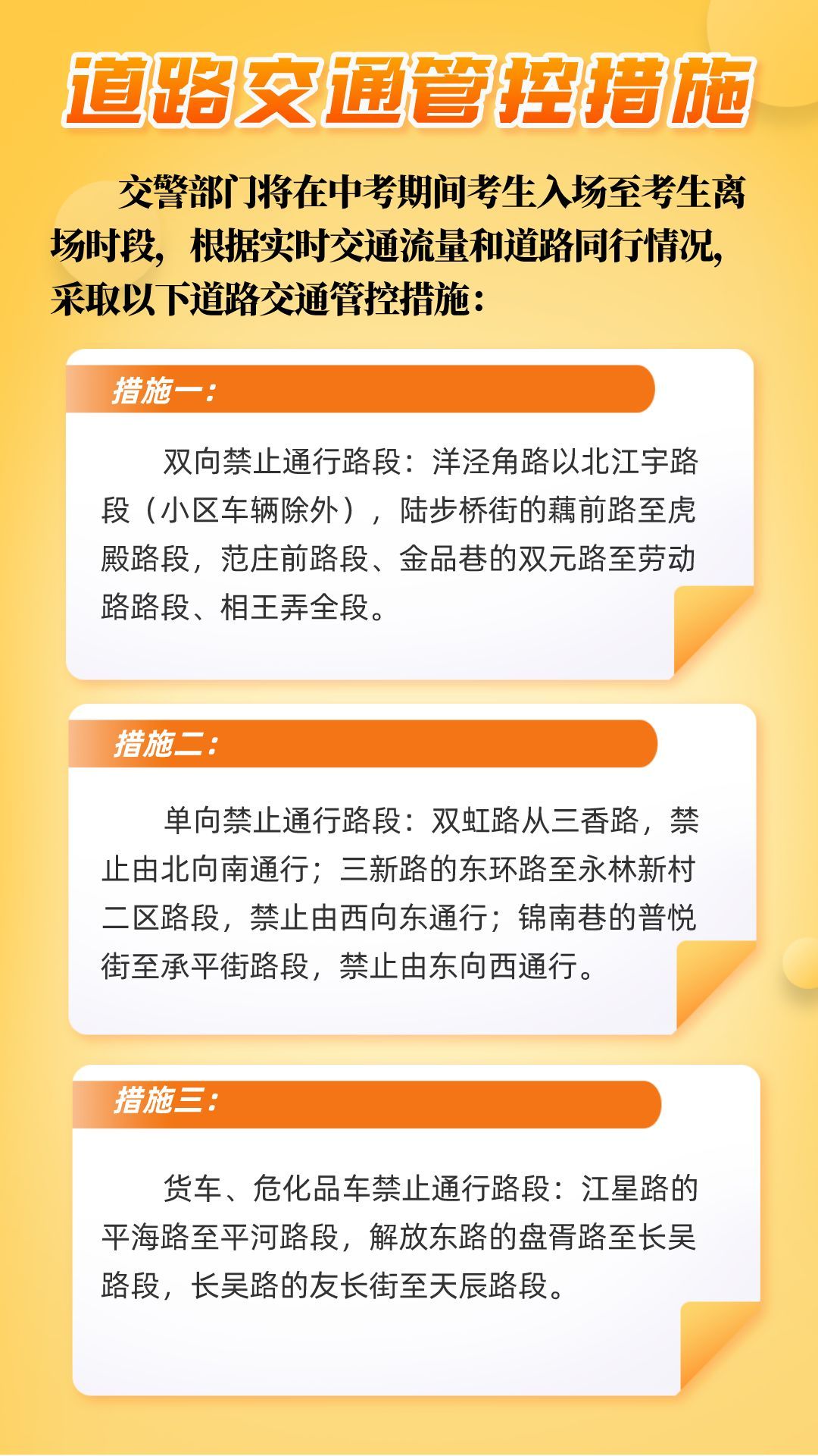 请考生及送考老师、家长预留充足时间、提前规划路线,避免因交通拥堵导致迟到,影响考生入场。请市民朋友提前了解考点设置及相关交通管制措施,避开送考高峰出行;途经考点附近应积极服从交警指挥与引导,自觉遵守交通法规,做到不随意占用道路资源、不随意停车下客,确保考点周边道路畅通,同时轻声快速通过,以免给考生带来影响。