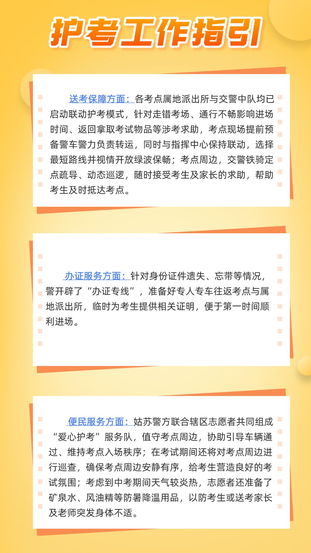 针对常见的涉考求助类型,结合多年的工作经验,姑苏警方分门别类设置应急预案,准备了三份护考工作指引,明确责任警力、规范处置流程,确保第一时间解决考生困难、保障顺利赴考。