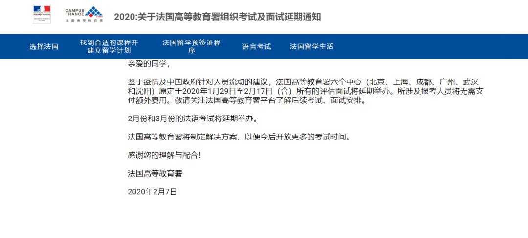 鉴于疫情及中国政府针对人员流动的建议,法国高等教育署六个中心(北京、上海、成都、广州、武汉和沈阳)原定于2020年1月29日至2月17日(含)所有的评估面试将延期举办。所涉及报考人员无需支付额外费用。2月份和3月份的法语考试将延期举办。