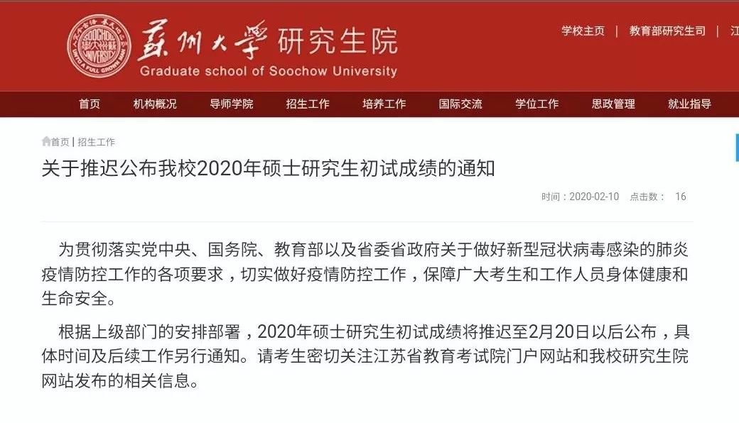 根据上级部门的安排部署,2020年硕士研究生初试成绩将推迟至2月20日以后公布,具体时间及后续工作另行通知。请考生密切关注江苏省教育考试院门户网站和苏州大学研究生院官网(http://yjs.suda.edu.cn)发布的相关通知。