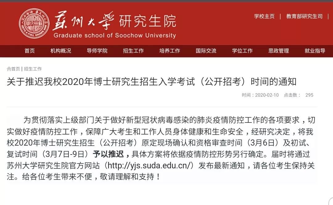 为贯彻落实上级部门关于做好新型冠状病毒肺炎疫情防控工作的各项要求,切实做好疫情防控工作,保障广大考生和工作人员身体健康和生命安全,经研究决定,将我校2020年博士研究生招生(公开招考)原定现场确认和资格审查时间(3月6日)及初试、复试时间(3月7日-9日)予以推迟,具体方案将依据疫情防控形势另行确定。届时将通过苏州大学研究生院官方网站(http://yjs.suda.edu.cn/)发布最新通知,请各位考生保持关注。给各位考生带来不便,敬请理解和支持!