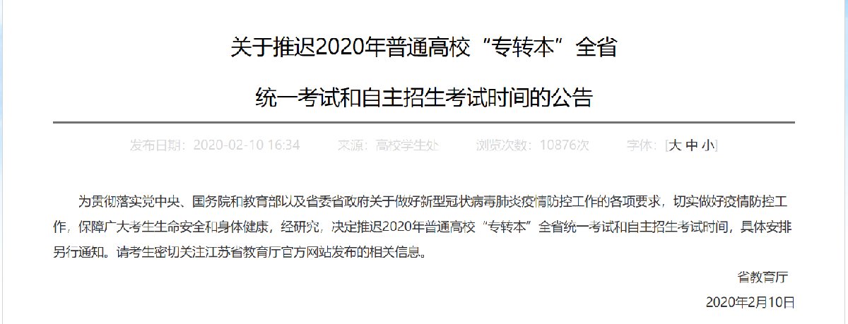 为贯彻落实党中央、国务院和教育部以及省委省政府关于做好新型冠状病毒肺炎疫情防控工作的各项要求,切实做好疫情防控工作,保障广大考生生命安全和身体健康,经研究,决定推迟2020年普通高校“专转本”全省统一考试和自主招生考试时间,具体安排另行通知。请考生密切关注江苏省教育厅官方发布的相关信息。