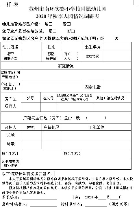苏州市南环实验小学校附属幼儿园秋季新生调研2020