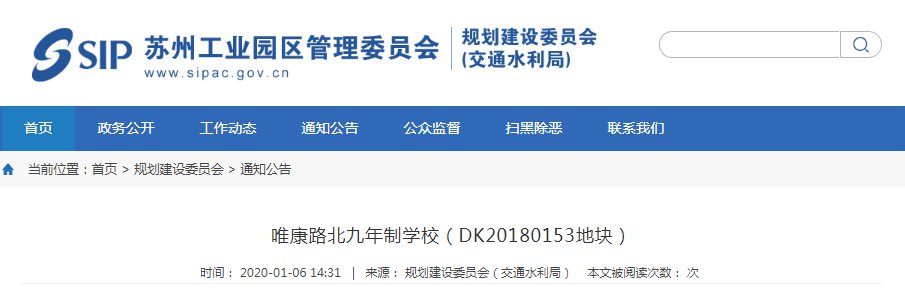 1月6日,苏州工业园区规划建设委员会网站发布了唯康路北九年制学校项目的方案公示。