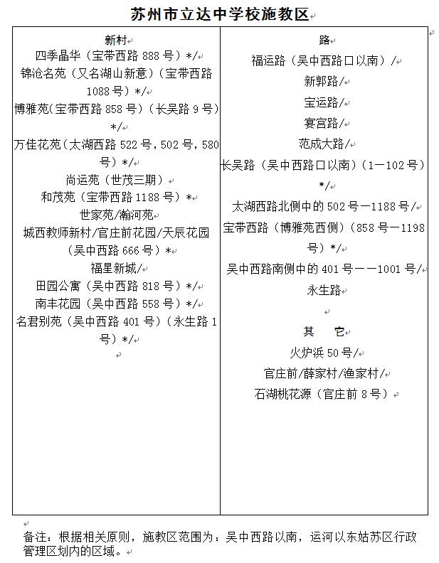 备注:根据相关原则,施教区范围为,吴中西路以南,运河以东姑苏区行政管理区划内的区域。