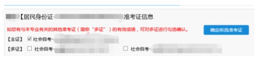 考生有本省多张准考证且其中成绩在本次毕业中需使用,则勾选相应准考证号,并点击【确定所选准考证】。(如勾选的多证没有电子准考证照片,按要求完成线上身份验证上后方可使用)。