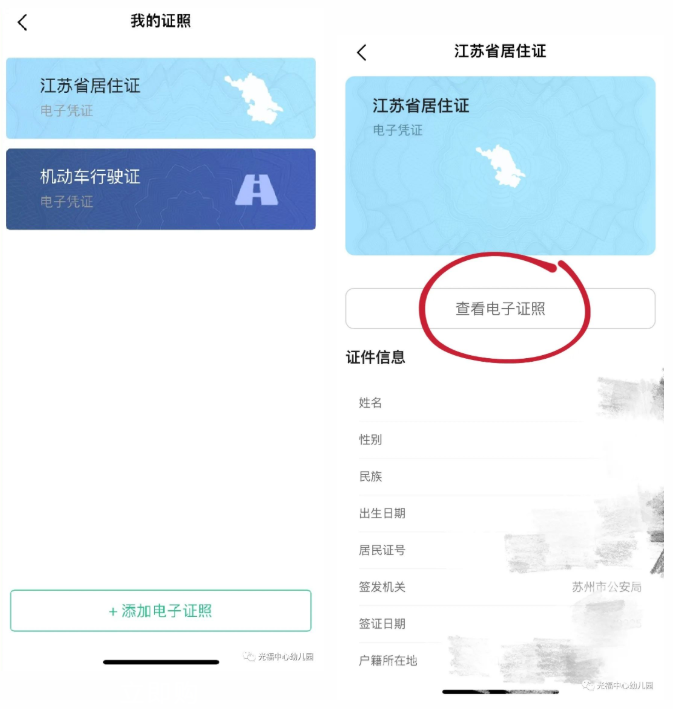 打开苏周到APP→我的→证照→江苏省居住证→查看电子证照→保存