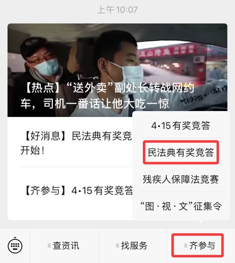 2、下方菜单“齐参与”中,找到“民法典有奖竞答”,进入答题页面即可答题。