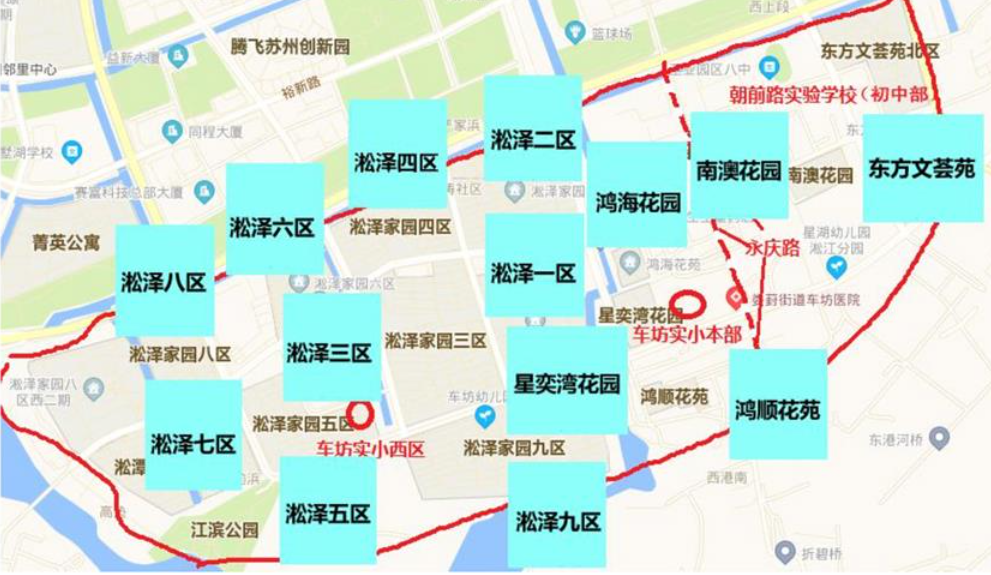 斜塘街道车坊地区,具体为苏申外港线以东、东方大道以南、东段吴淞江以西和南段吴淞江以北范围,包括淞泽家园一至九区、东方文荟苑、南澳花园、鸿海花园、鸿顺花苑、星奕湾花园等。