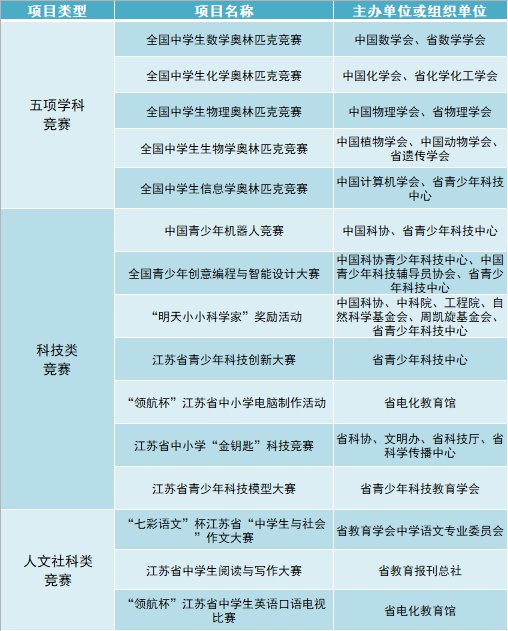 (一)竞赛类:高中阶段参加全国中学生五项学科竞赛(数学、化学、物理、生物、信息学)获得省级赛区三等奖及以上;或者科技类、人文社科类竞赛获得省级赛区一等奖及以上。竞赛类项目表详见附件1。