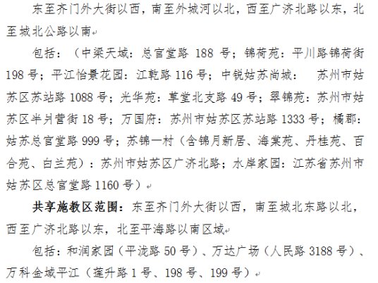 备注:以上施教区为苏州市南环实验小学校和苏州市平直实验小学校共享施教区,施教区内符合入学条件的适龄儿童,可自愿在以上两所小学中的一所接受义务教育,均视作地段生。