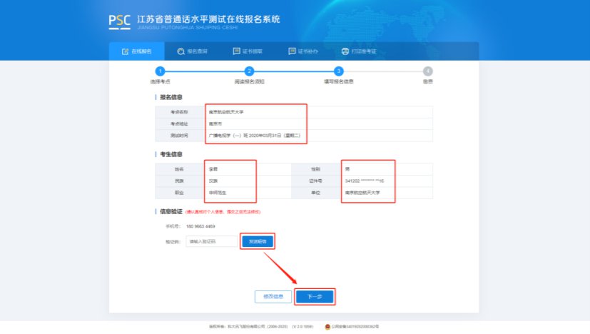 6.核对报名及考生信息并进行验证,若信息有误,点击“修改信息”返回修改,无误点击“下一步”(注意:信息一旦提交,无法修改)。点击发送短信,正确点击图片验证,并准确输入手机收到的验证码。