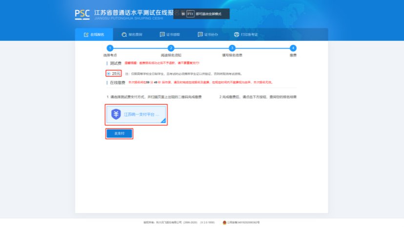 7.在线缴费。选择测试费用及支付方式,点击“去支付”,使用微信或支付宝扫描二维码完成支付。(注意:请在支付时限内完成支付,若在规定时间内不缴费视为放弃,本次报名无效;缴费报名成功之后不予退款,且不要重复支付)