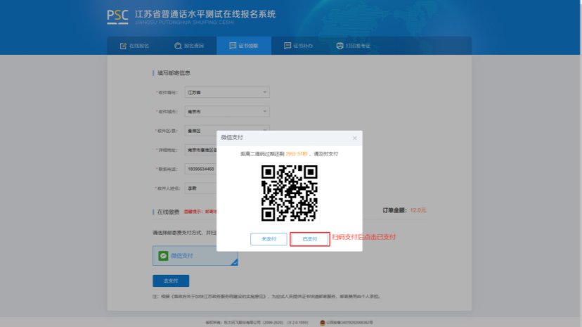 2010年后,在江苏参加测试且取获得新版证书的考生若有补办需求,可在证书补办中查询到历史成绩,在对应历史成绩列表中点击补办申请,并进行邮寄信息的填写,完成支付,由省测试中心完成补办申请并在 5 个工作日内寄出证书(注意:证书补办仅支持邮寄,若成绩记录中无照片请联系考试时所在考点并提供照片,待考点上传照片后再申请补办)。