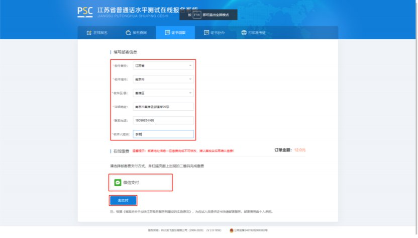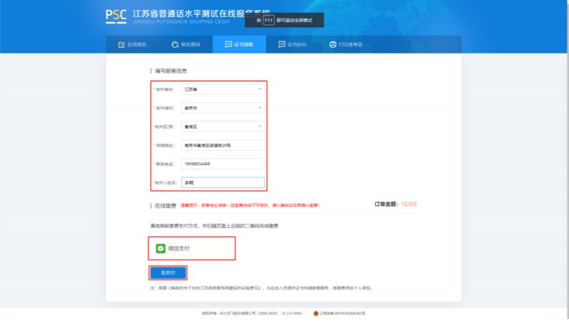 8.填写邮寄信息。选择证书邮寄的考生填写证书邮寄信息,点击“微信支付”扫完码完成支付(注意:缴费完成后邮寄信息不可修改)。选择“考点自取”的考生跳过这一页。